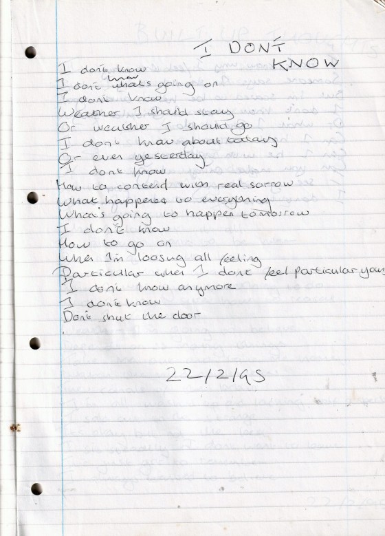 I Do Not Know – Written Wednesday 22nd February 1995 (Aged 19)