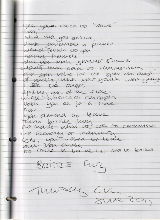 Brittle Fury yes, you have voted to, ‘leave’butwhat did you believe?that governments in powerwould return to youholding flowersdid you think … More
