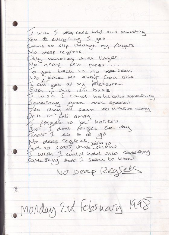 No Deep Regrets i wish i could hold onto something yet everything i getseems to slip through my fingersno deep … More