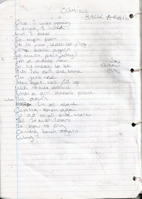 Coming Back Again – Written Saturday 12th November 1994 (Aged 19) i cried, i lived and i died so much pain do it now, learn to fly